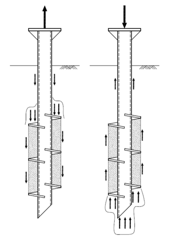 Schroefpalen bieden goede weerstand tegen trek en duwkracht zoals in de afbeelding wordt weergegeven. Tegenwoordig zijn schroefpalen steeds meer ontwikkeld en kunnen steeds meer trek en duw kracht weerstaan.